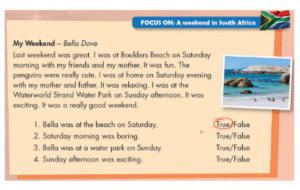 Last weekend was great. I was at Boulders Beach on Saturday morning with my friends and my mother. It was fun. The penguins were really cute. I was at home on Saturday evening with my mother and father. It was relaxing. I was at the Waterworld Strand Water Park on Sunday afternoon. It was exciting. It was a really good weekend.