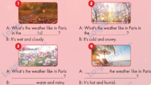 🔊 My name’s Huyền. I live in Ho Chi Minh City. There are only two seasons here: rainy season and dry season. The rainy season is usually from May to November, and the dry season is from December to April. In the rainy season, it’s humid and rainy. There are often showers in the afternoons. Sometimes, there are rainstorms and thunderstorms. I stay at home a lot in the rainy season. It’s hot and dry in the dry season. The weather is often sunny with lots of sunshine. I like going for walks in the dry season. Sometimes, it gets really hot, and I like staying inside. My favorite weather is in the rainy season because the weather is cool.