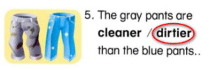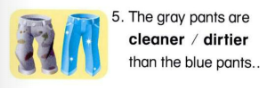 5, 🔊 The gray pants are cleaner than the blue pants.