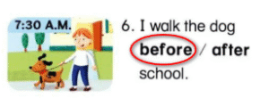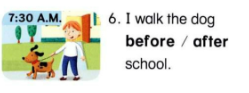 6, 🔊 I walk the dog before school.
