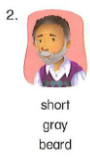 🔊 He has short, gray hair and a beard.- Ông ấy có mái tóc ngắn màu xám và có râu.