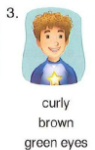 🔊 He has curly, brown hair and green eyes.- Cậu ấy có mái tóc xoăn màu nâu và mắt xanh lá.