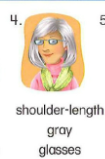 🔊 She has shoulder-length, gray hair and glasses.- Bà ấy có mái tóc xám dài ngang vai và đeo kính.