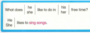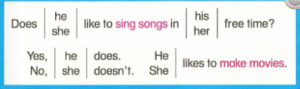 2. 🔊 Does he like to sings song 🔊 in his free time? – Anh ấy có thích hát vào lúc rảnh không?