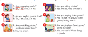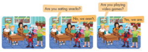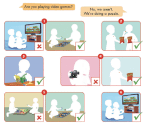 Cách chơi: Các bạn trong lớp sẽ lần lượt hỏi hai bạn đứng trên bảng với mẫu câu “Are you + V-ing?” Hai bạn trên bảng sẽ trả lời lại với mẫu câu “No, we aren’t” nếu không đúng và trả lời với mẫu câu “Yes, we are” nếu đúng.