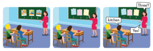 Ví dụ: Cô sẽ chọn thẻ ở vị trí số 3 và nói: “Three?”, các bạn sẽ đoán nhanh là phòng bếp: “kitchen”