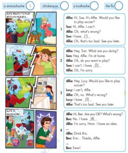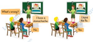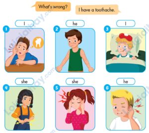 Cách chơi: Chia đội. Mỗi lượt chơi mỗi đội sẽ cử lên 1 bạn, đứng quay lưng lại với bức tranh minh hoạ. Các bạn còn lại trong đội ngồi dưới sẽ sử dụng cấu trúc câu hỏi “What’s wrong?”, bạn đứng trên bảng sẽ sử dụng cấu trúc đã học, lần lượt trả lời, cho đến khi nào đúng với bức tranh minh hoạ thì thôi.