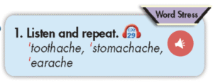 Sue: a stomachache.">🔊 I have (1) a stomachache.