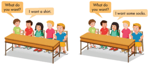 Người thứ nhất sẽ hỏi với câu hỏi: “What do you want?”. Người thứ 2 sẽ trả lời: “I want a shirt.” và hỏi tiếp người thứ 3 lại câu hỏi đó: “What do you want?”. Người thứ 3 trả lời: “I want some socks.” và lại tiếp tục hỏi người thứ 4. Mỗi bạn sẽ lần lượt chuyền nhau trả lời và hỏi cho đến khi nào hết lượt.