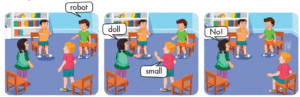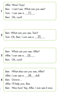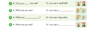 B:🔊 I can see a small doll. (Tôi có thể nhìn thấy một con búp bê nhỏ.)