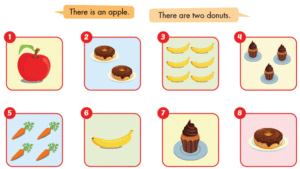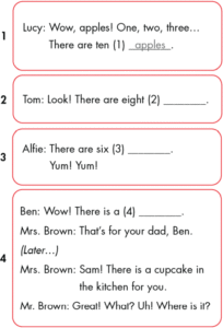 1. Lucy: 🔊 Wow, apples! One, two, three… There are ten apples. (Uầy, táo này! Một, hai, ba… Có mười quả táo.)