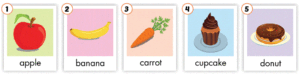 Cách chơi: Cô sẽ dán thẻ là hình về đồ ăn (ví dụ: apple, cupcake, carrot, banana, donut …) lên bảng, các bạn nhìn qua một lượt và ghi nhớ đồ ăn có trên bảng. Cô sẽ lấy đi bất kì một thẻ nào, các bạn dưới lớp úp mặt xuống bàn và không được nhìn lên bảng. Khi cô đã hoàn thành và hỏi thẻ hình nào bị thiếu thì các bạn mới ngẩng đầu lên, nhìn lên bảng và trả lời nhanh.