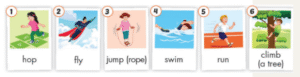 1. hop | 2. Yes, I can | 3. No, he can’t | 4. fly |