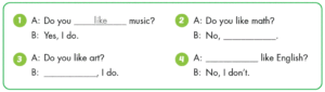 Alfie: 🔊 Math? (4) Yes, I do./No, I don’t. (Toán sao? Không, tớ không thích.)