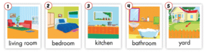 🔊 He’s in the yard. (Anh ấy ở trong sân.)