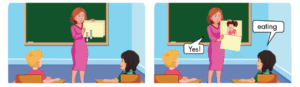 Ví dụ: Cô sẽ mở từ từ cho các bạn nhìn thấy bức tranh về một bạn đang ăn, các bạn dưới lớp phải đoán nhanh đó là ”eating”.