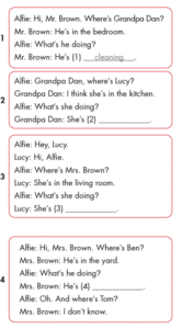 Mr. Brown: 🔊 He’s (1) cleaning. (Ông ấy đang quét dọn.)