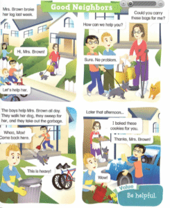 🔊 The boys help Mrs. Brown all day. They walk her dog, they sweep for her, and they take out the garbage.