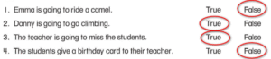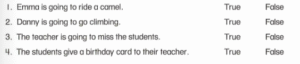 4. 🔊 The students give a birthday card to their teacher. ➝ False (They give a goodbye card to their teacher.)