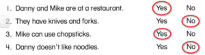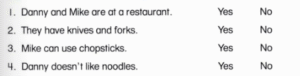 4. 🔊 Danny doesn’t like noodles. → No (Vì: Danny thấy mì rất ngon.)