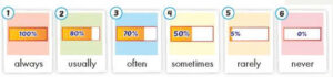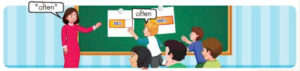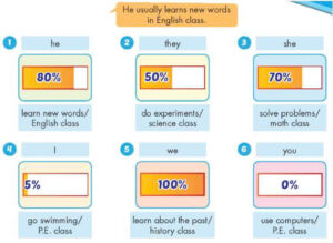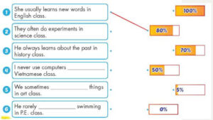 | 🔊 Activity Hoạt động | 🔊 I always learn new words in English class. Tôi luôn học từ mới trong lớp tiếng anh. | 🔊 She usually experiments in scence class. Cô ấy thường xuyên làm thí nghiệm trong lớp khoa học. | 🔊 He often makes things in art class. Anh ấy làm thủ công trong lớp mỹ thuật. |
