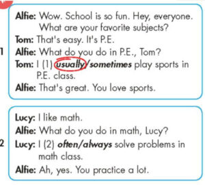 Tom: usually play sports in P.E. class.">🔊 I (1) usually play sports in P.E. class.