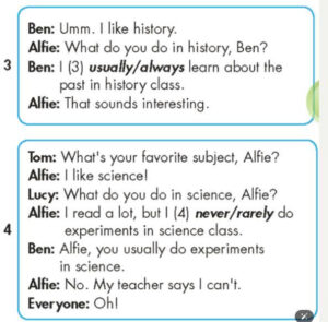 Alfie: rarely do experiments in science class.">🔊 I read a lot, but I (4) rarely do experiments in science class.
