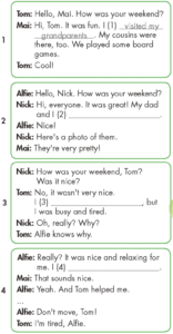 Mai: visited my grandparents. My cousins were there, too. We played some board games.">🔊 Hi, Tom. It was fun. I (1) visited my grandparents. My cousins were there, too. We played some board games.