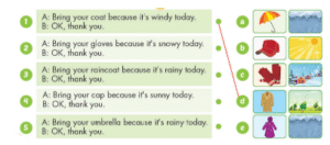 Mrs. Brown: Sure. Oh, Bring your raincoat because it’s rainy today.