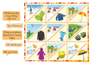Cách chơi: Mỗi đội 2 bạn. 2 bạn trong cùng 1 đội đối đáp với nhau , cố gắng tạo ra các cặp câu miêu tả đúng 2 hình ảnh trong cùng 1 ô vuông như trong bảng. Đội nào đạt được các ô vuông tạo thành 1 hàng ngang/dọc/chéo trước thì thắng.