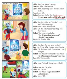 Robot: take some medicine.">🔊 You shouldn’t eat candy. You should (3) take some medicine.