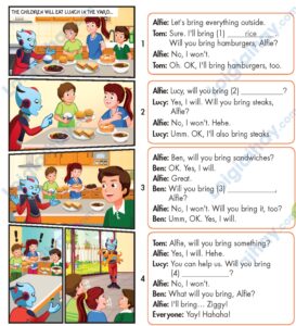Tom: rice. Will you bríng hamburgers, Alfie?">🔊 Sure. I’ll bring (1) rice. Will you bríng hamburgers, Alfie?