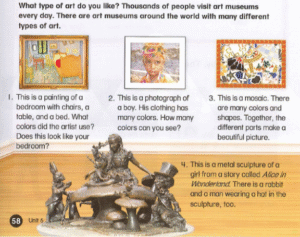 Bản dịch Tiếng Việt: Bạn thích loại hình nghệ thuật nào? Mỗi ngày có hàng ngàn người đến thăm các viện bảo tàng nghệ thuật. Trên khắp thế giới có nhiều bảo tàng trưng bày các loại hình nghệ thuật khác nhau.