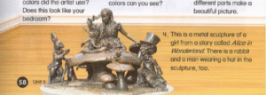 4. 🔊 This is a metal sculpture of a girl from a story called Alice in Wonderland. There is a rabbit and a man wearing a hat in the sculpture, too.