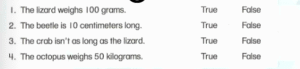 3. 🔊 The crab isn’t as long as the lizard. → ✅ True (Crab’s legs are about 2m, lizard is 3m)