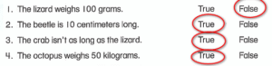 1. 🔊 The lizard weighs 100 grams. → ❌ False (It weighs 150 kilograms)