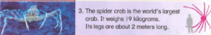 3. 🔊 The spider crab is the world’s largest crab. It weighs 19 kilograms. Its legs are about 2 meters long.