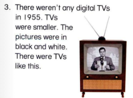 3. 🔊 There weren’t any digital TVs in 1955. TVs were smaller. The pictures were in black and white. There were TVs like this.