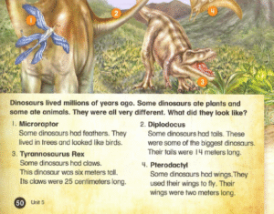 Bản dịch tiếng Việt:  Khủng long đã sống cách đây hàng triệu năm. Một số loài khủng long ăn thực vật, một số khác ăn động vật. Chúng rất khác nhau. Chúng trông như thế nào?