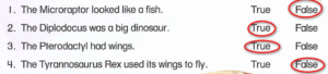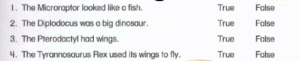 1. 🔊 The Microraptor looked like a fish. →  False (🔊 Microraptor looked like a bird, not a fish. It had feathers and lived in trees.)