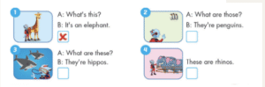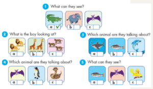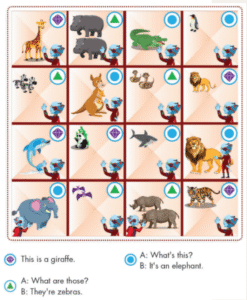 Cách chơi: Dựa vào các hình nhận biết ở góc phải của các hình các bạn sẽ đặt câu hoặc hỏi và trả lời, tương ứng với từng loài động vật trong hình.