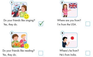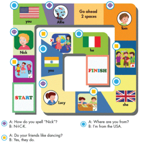 Di chuyển vào ô có biểu tượng này thì trong ô sẽ là lá cờ của các nước. Một người bạn bên ngoài sẽ đặt câu hỏi người đó từ đâu đến, bạn đứng ở vị trí ô đó chú ý (you/he/she) để trả lời cho đúng.