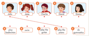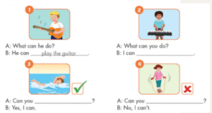 My name’s Mian. I can play the guitar and swim. I can also ride a bike. I can’t drive a car. I can’t jump rope. What about you? What can you do?