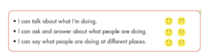 Cách chơi: Các bạn chơi lần lượt từng hình một theo một vòng như trong ảnh, với hình ảnh có kí hiệu màu tím sẽ nói mẫu câu hỏi “Are you doing something?” và câu trả lời là “Yes, I am/ No, I’m not.” với hình ảnh có kí hiệu màu vàng sẽ sử dụng mẫu câu hỏi “ Is he/she hoặc Are they doing something?” và mẫu câu trả lời là “ Yes, he/she is; Yes, they are hoặc No, he/she isn’t. He/ she’s doing something.” với hình ảnh có kí hiệu màu xanh sẽ sử dụng mẫu câu hỏi “What are you doing?” và mẫu câu trả lời là “I’m + V-ing at + địa điểm.”