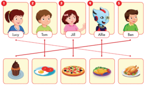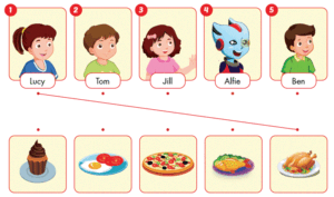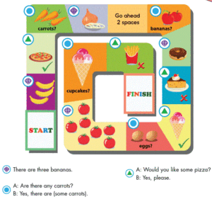 Di chuyển vào ô có biểu tượng này thì một người nhìn hình trong ô để hỏi bạn kia có muốn đồ ăn này không, một người trả lời. (Chú ý dấu (√) hoặc (X) để trả lời Yes hoặc No cho đúng.)