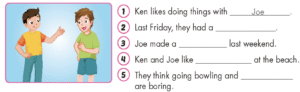 I’m Ken, and my best friend is Joe. Joe has blond hair and blue eyes. He and I love doing things together. We like having barbecues and sleepovers. We had a really fun sleepover last Friday. We like baking cupcakes and cooking on the weekends. Joe is really good at cooking. Last weekend, he made a delicious cake. Joe and I also like traveling. We went hiking in the mountains last month. It was really fun. We went to the beach, too. We love playing games at the beach. We didn’t go in the ocean because we don’t like swimming. Swimming in the ocean is scary. We also don’t like painting pictures or going bowling. They are boring activities. Joe and I like more exciting things.