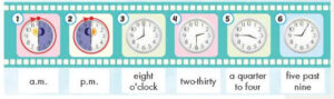2. 🔊 I have lunch at school at twelve o’clock. My geography class starts at one o’clock in the afternoon.