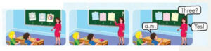 🔊 On Wednesday, my English class starts at seven o’clock in the morning. After that, my math class starts at a quarter past eight a.m. I have geography class at five to ten a.m. In the afternoon, I have science class at one-thirty. And, my Vietnamese class starts at two-forty p.m.