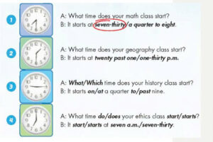 1. 🔊 What time does your English class start? Lớp tiếng Anh của bạn bắt đầu lúc mấy giờ?