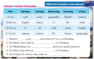 🔊 An’s Vietnamese class starts at 7:20 a.m. on Thursdays. Her English class starts at a quarter past nine on Thursdays. Her geography class starts at twenty to two in the afternoon, and her ethics class starts at 3 p.m. On Fridays, her art class starts at twenty past seven. After that, she has music class at eight o’clock in the morning. She has English class again on Fridays. Her English class starts at a quarter past nine, and her P.E. class starts at one-forty on Fridays. Her science class starts at 3 p.m.